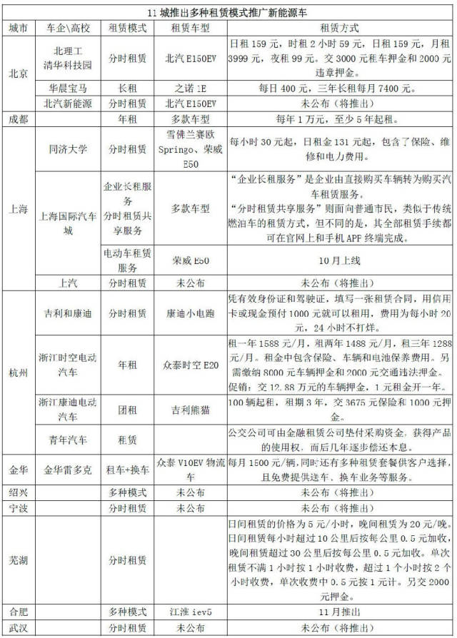 近期,各地新能源汽车推广方案纷纷出台,多数城市明确表示将探索租赁模式推广新能源汽车。目前,北京、上海、杭州、芜湖、成都、宁波等11城已开始推行电动汽车租赁模式。同样,上汽、北汽、康迪等汽车企业也在大力推广。